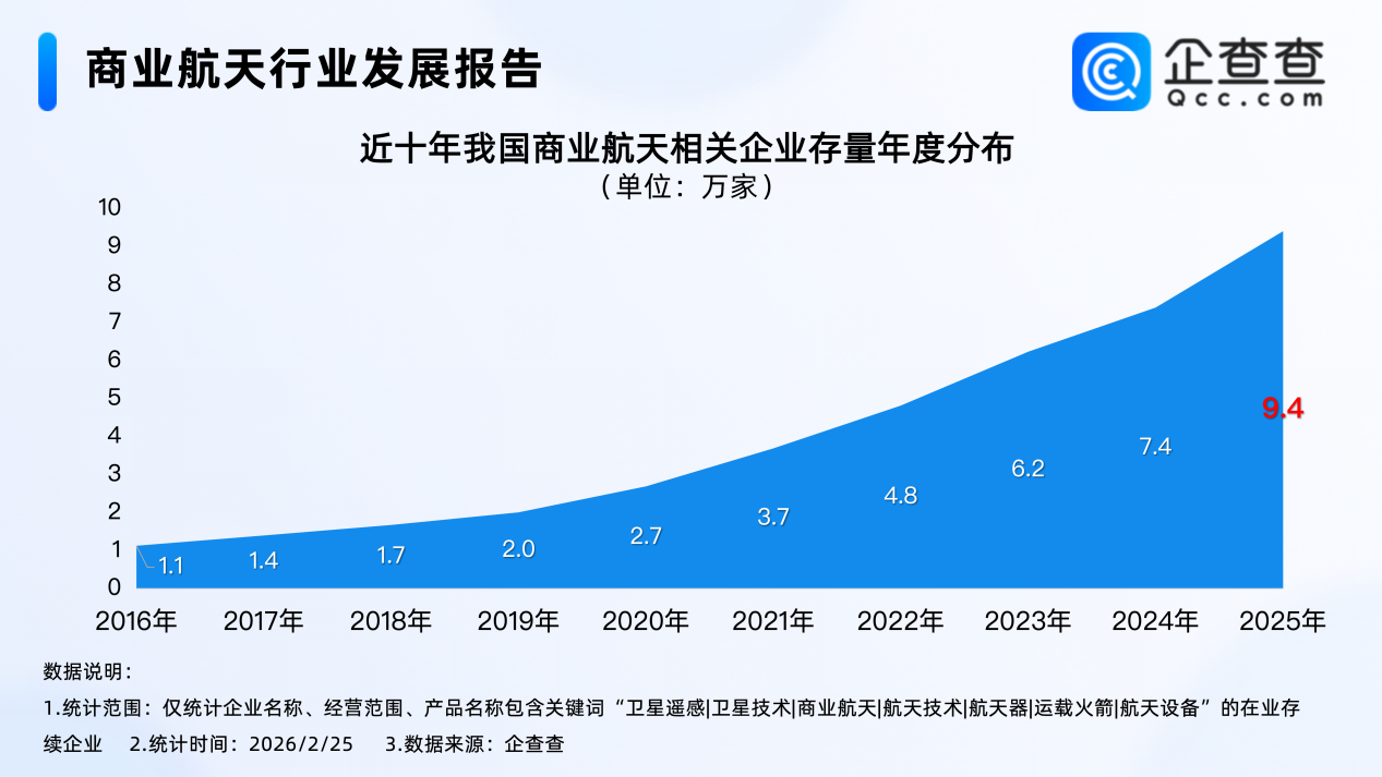 企查查数据披露,近十年,我国买卖航天相干企业存量逐年加多,从2021年运转,每年存量加多过万家,2025年年底,我国买卖航天相干企业存量比拟2024年年底加多超2万家。规矩2026年2月25日,我国现有9.6万家买卖航天相干企业。