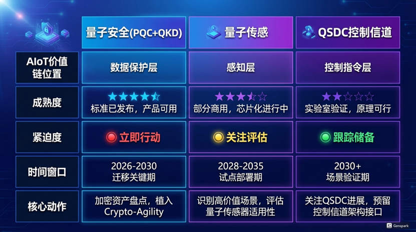 接下来,我会沿着“分级驻扎→精确感知→真实为止”这条AIoT价值链逐个拆解。下图将三条本事干线的老练度、时辰窗口、对AIoT的本质影响,以及举止优先级,呈当今一王人,它将是全文的导航仪。