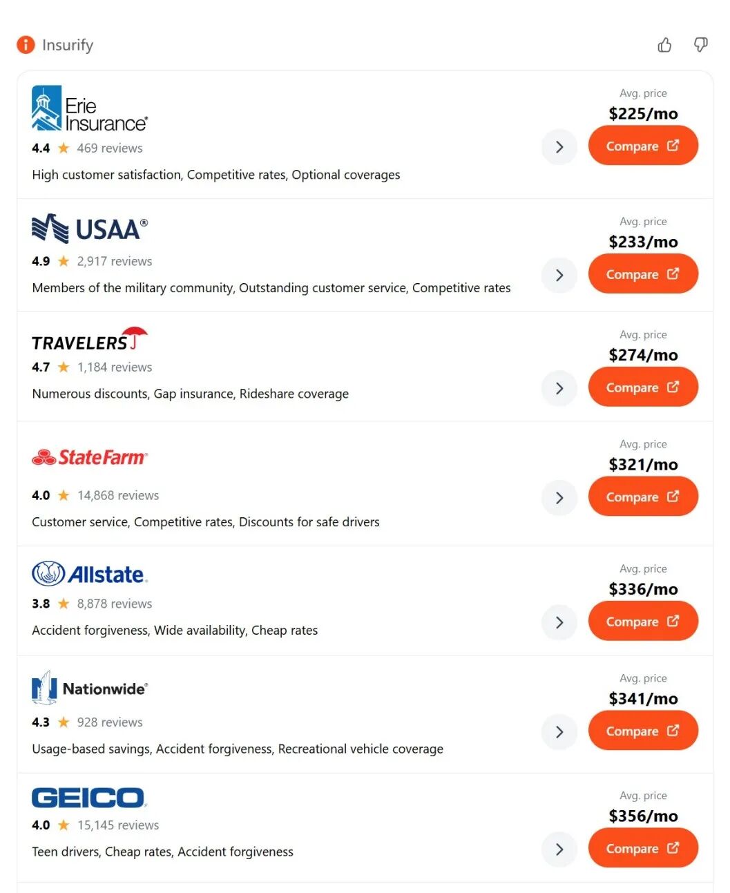 它给了Erie、Allstate、GEICO等共8家公司的参考报价,并附上了投保一语气,默示参加后系统会补充驾驶东谈主年齿、信用评分区间、具体保障额度等信息,以生成最终追究报价。