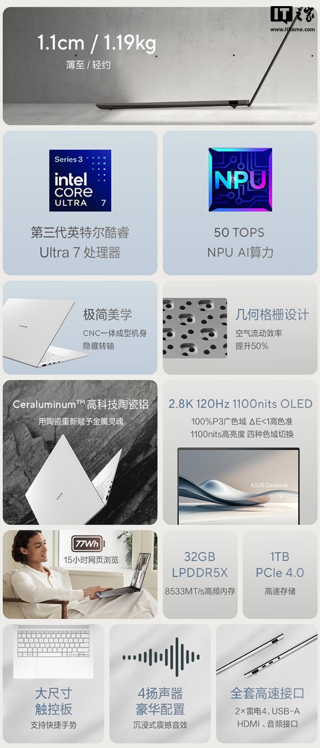 IT之家获悉,该机领有雪域白 / 烟岚灰配色,幸运5星彩使用 CNC 一体成型机身,全体厚度 1.1cm、分量 1.19Kg,B 面配备一块 2880x1800 折柳率 120Hz OLED 面板(峰值亮度 1100 尼特、障翳 100% DCI-P3 色域);札记本内置四扬声器,左侧配备 1 个 HDMI 2.1、2 个雷电 4、1 个 3.5mm 接口、1 个 USB-A 接口。