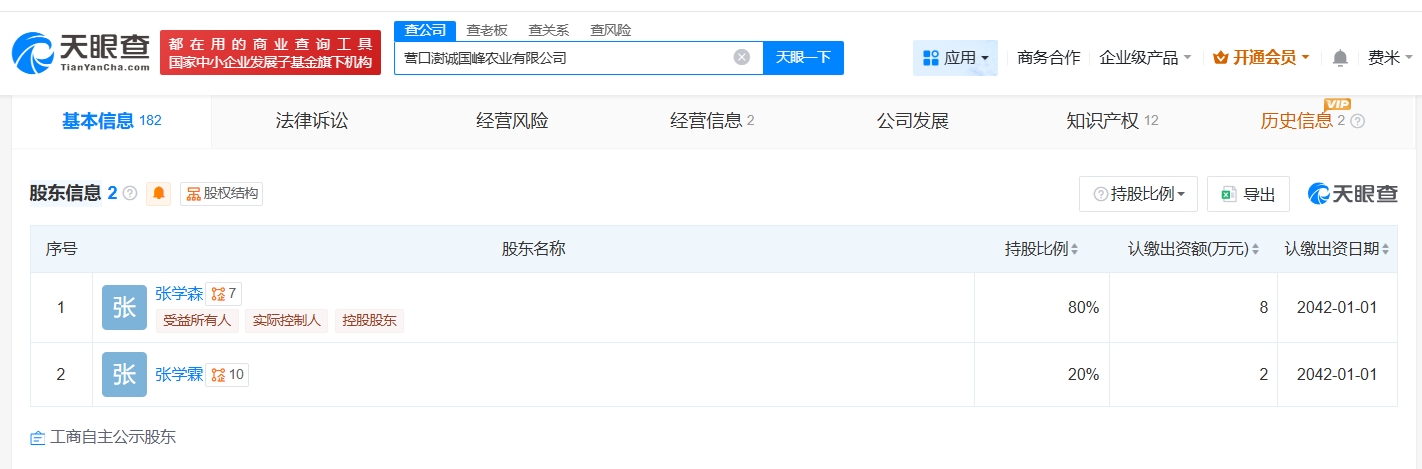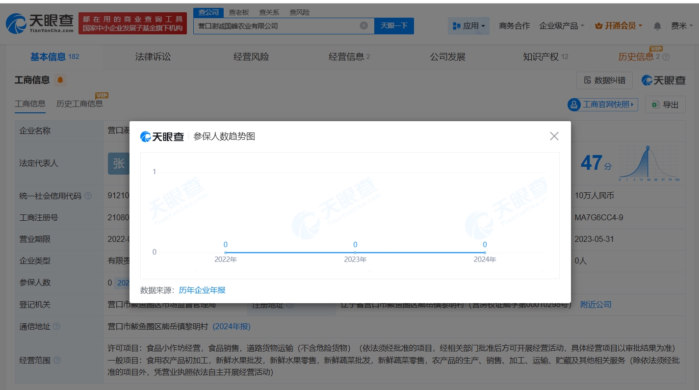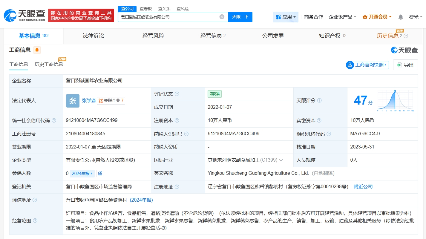 天眼查App披露,幸运5星彩营口澍诚国峰农业有限公司树立于2022年1月,法定代表东说念主为张学森,注册成本10万东说念主民币,计较规模包括食物小作坊计较、食物销售、说念路货品运输等,由张学森、张学霖共同握股。年报信息披露,该公司贯穿多年参保东说念主数为0。