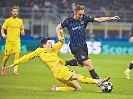 {jz:field.toptypename/}海外米兰队球员与博德精通队球员费特(左)在比赛中拼抢。新华社供图