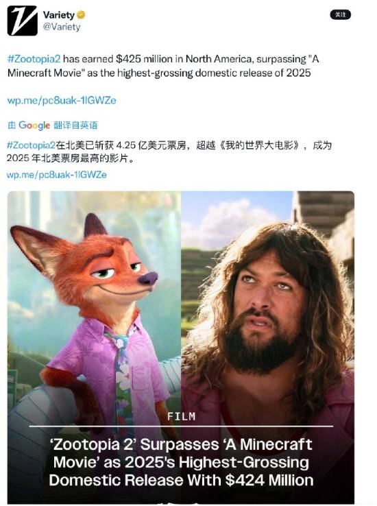 近日,迪士尼动画电影《荒诞动物城2》传来票房喜信,其在北好意思商场的累计票房已认真打破4.25亿好意思元,生效卓绝《我的寰宇大电影》,登顶2025年北好意思电影票房榜榜首。