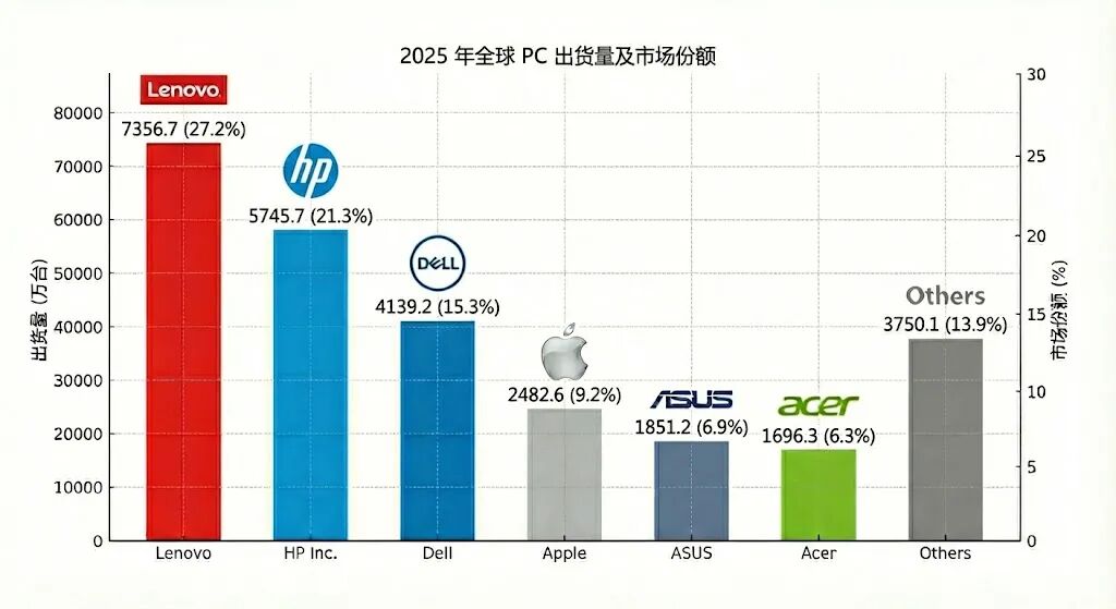数据骄贵,2025年 联思 在全球PC市集的全年出货量达到7356.7万台,市占率高达27.2%,远远甩开第二名惠普(21.3%)和第三名戴尔(15.3%),呈现出久违的“断层式当先”。