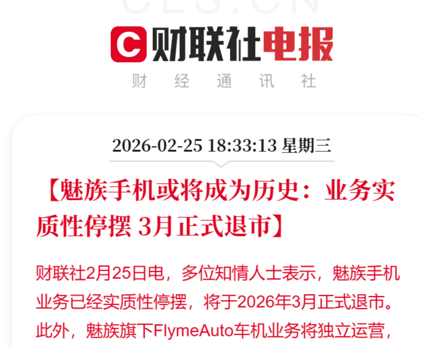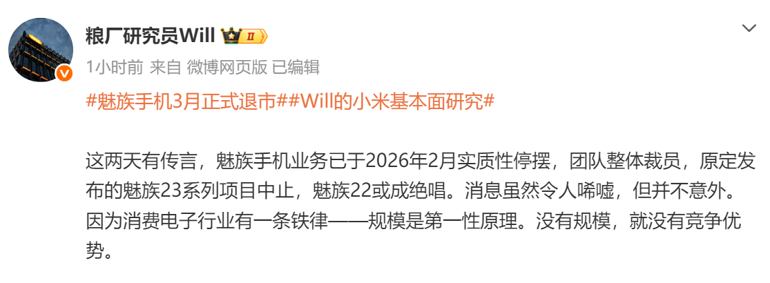 【CNMO科技音信】近期,多家媒体发文称,魅族手机业务仍是本色性停摆,将于2026年3月精致退市。此外,魅族旗下FlymeAuto车机业务将寂寥运营,魅族品牌或将链接保留在寂静体系内。2月26日,有业内东谈主士发文称,关于手机企业来说,年出货1亿台是下限,因为消耗电子行业遵从“范围是第一性旨趣”,无范围则无竞争上风,居品再好也没用。