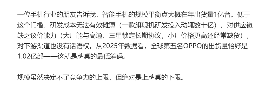 {jz:field.toptypename/}一位手机行业东谈主士清晰,智高手机的范围均衡点大致在年出货量1亿台。低于此门槛,研发资本无法有用摊薄,对供应链穷乏议价才能,对卑劣渠谈也难熬语权。2025年大家第五名OPPO出货量适值是1.02亿部,这是行业“入场”的最低筹码。