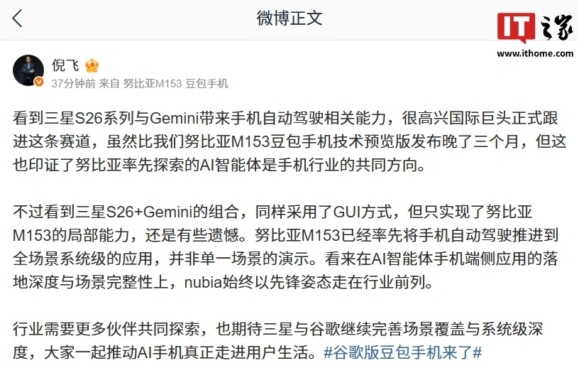 IT之家注意到,中兴通信末端劳动部总裁、努比亚本领有限公司总裁倪飞当天发文谈及了三星的新品发布会。他默示,看到三星 S26 系列与 Gemini 带来手机自动驾驶有关才气,开云app很激动外洋巨头跟进这条赛谈,诚然比努比亚 M153 豆包手机本领预览版发布晚三个月,但也印证了 AI 智能体是行业共答允见。