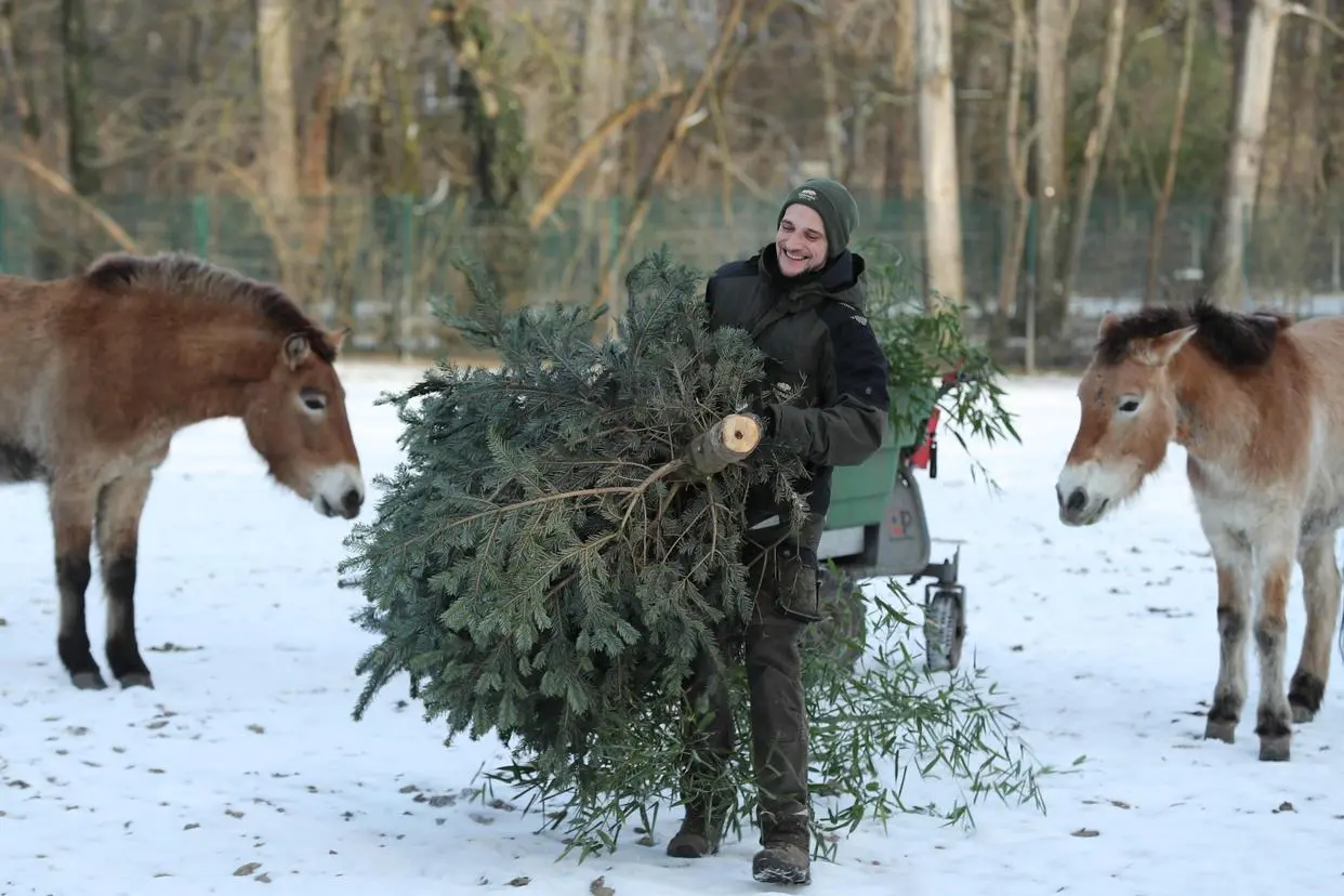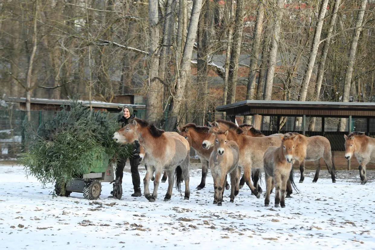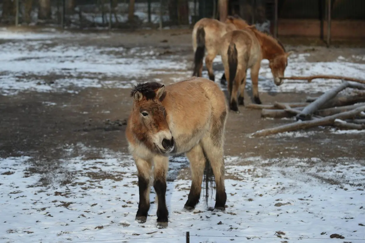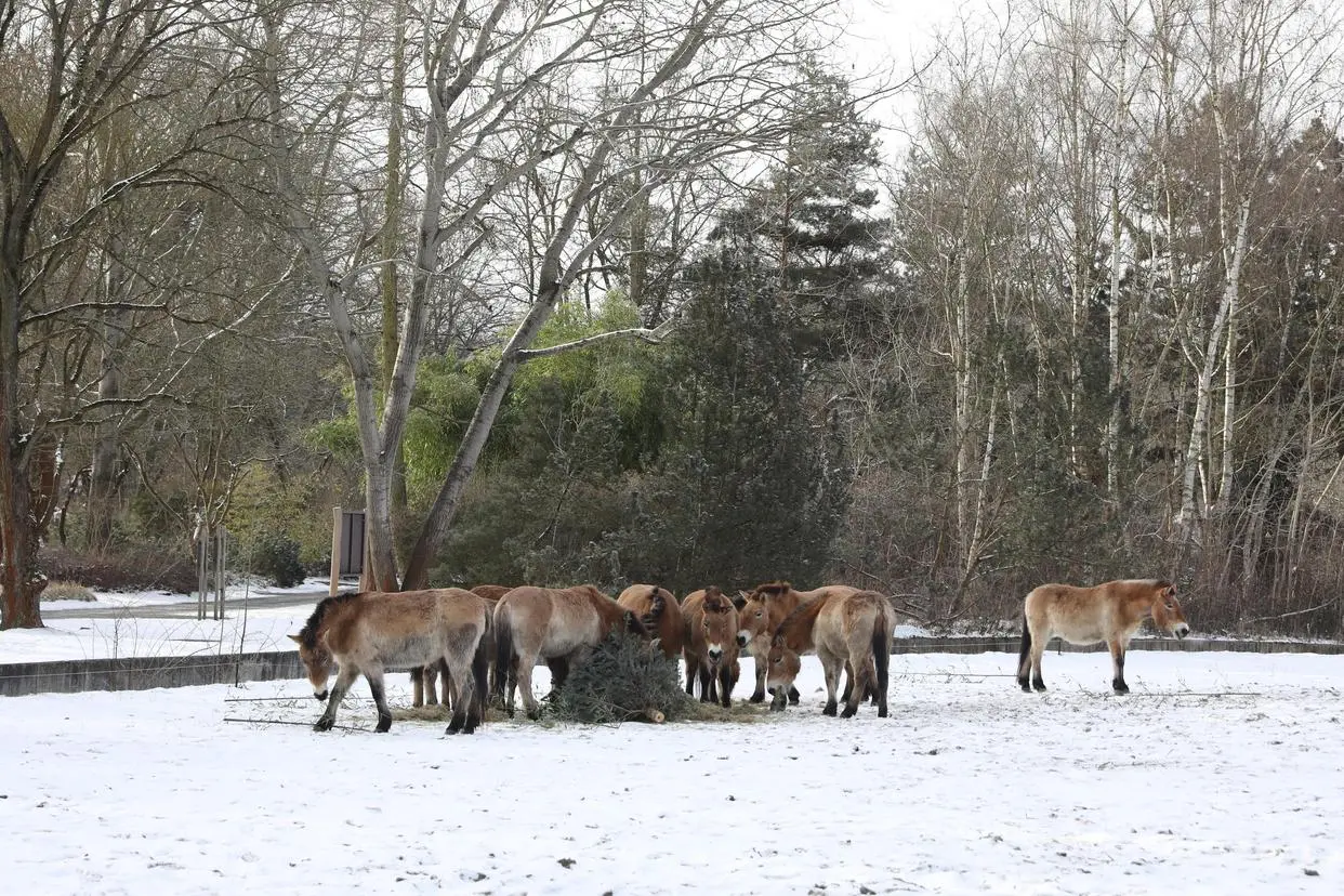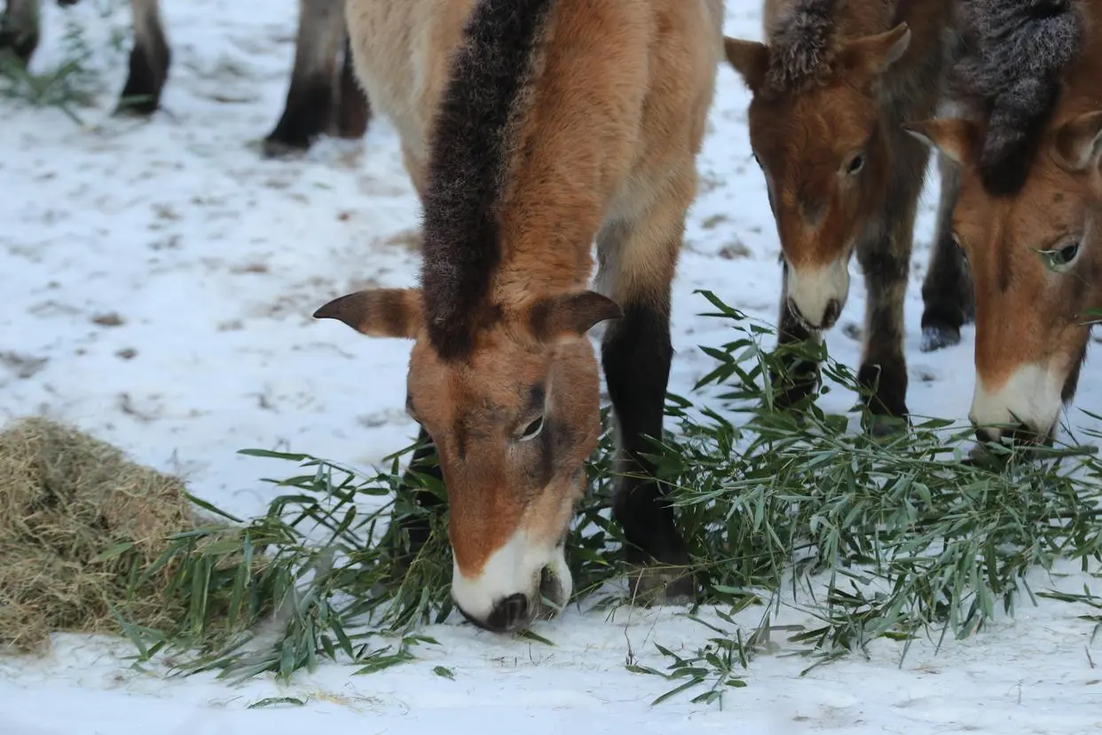 柏林动物公园的马场一派白净,十几匹沙棕色的普氏野马围着雪地中央的草垛埋头吃着早餐,它们把鼻子埋进草堆,呼出的热气落回鬃毛上结成轻细的霜。动物公园哺乳动物负责东谈主马丁·克朗茨林说:“它们相配可爱嚼叶子。”