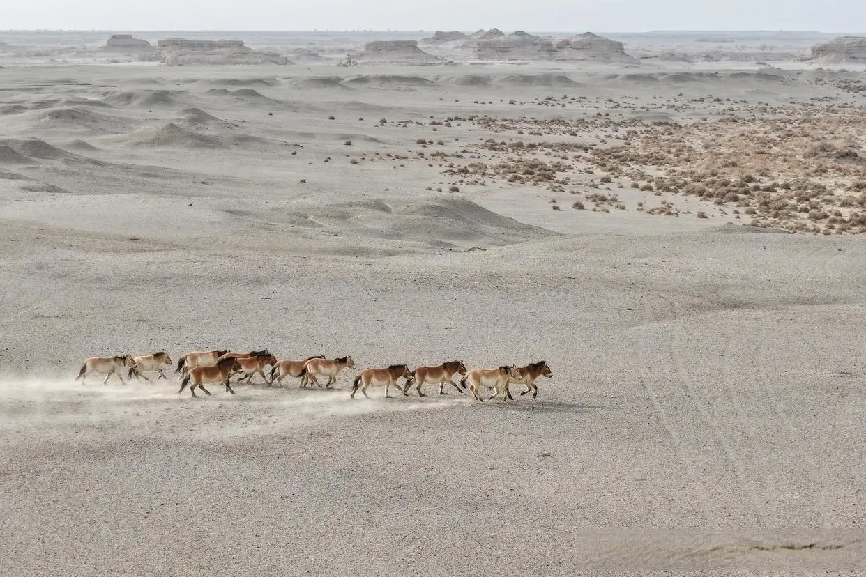 ↑2月5日,一群普氏野马在甘肃敦煌西湖国度级当然保护区的戈壁萧索上奔走(无东谈主机相片)。