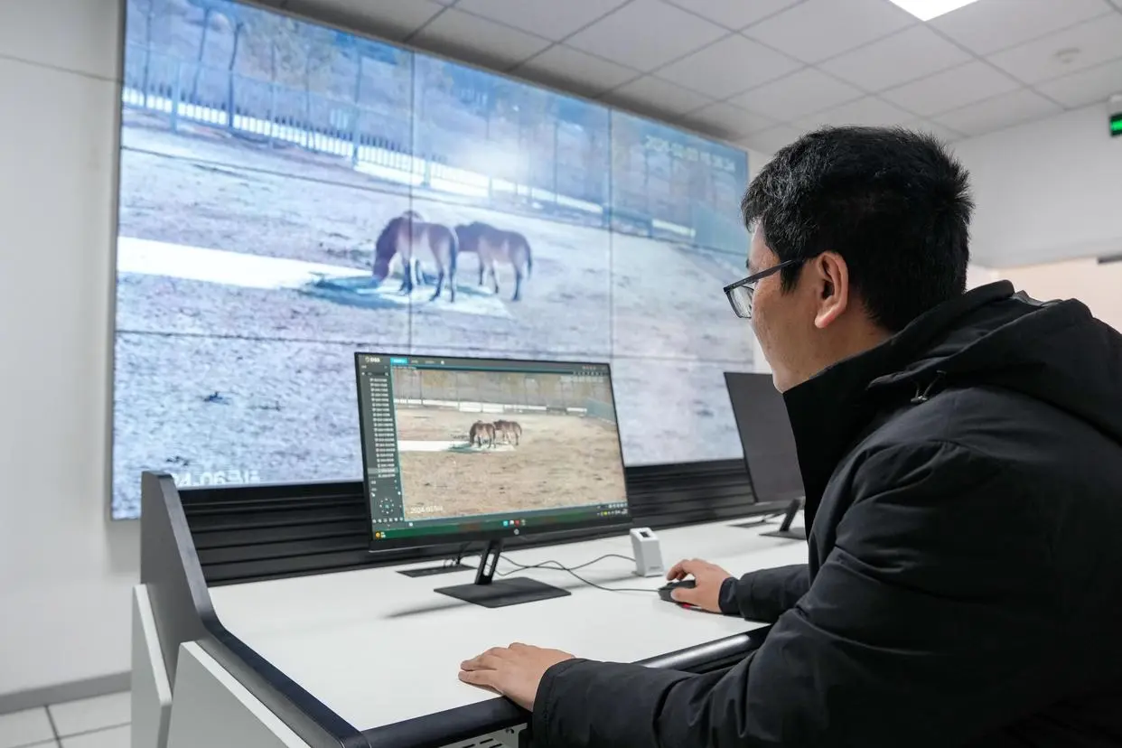 ↑2月3日,幸运5星彩在甘肃濒危动物保护中心普氏野马饲养繁育基地,职责主谈主员监控不雅察普氏野马进食情况。