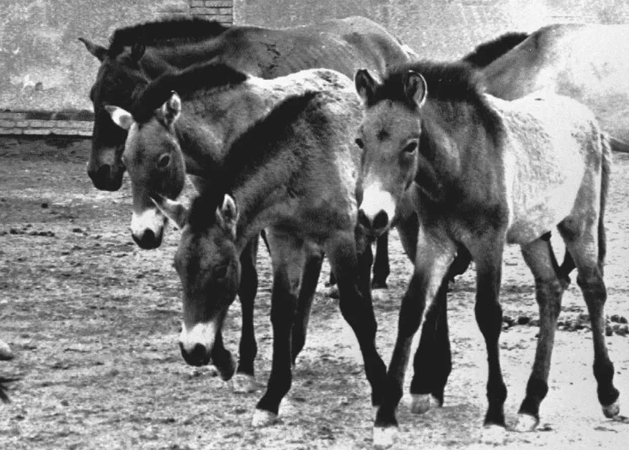 ↑甘肃濒危动物保护中心引进繁育的普氏野马。(1995年府上相片)