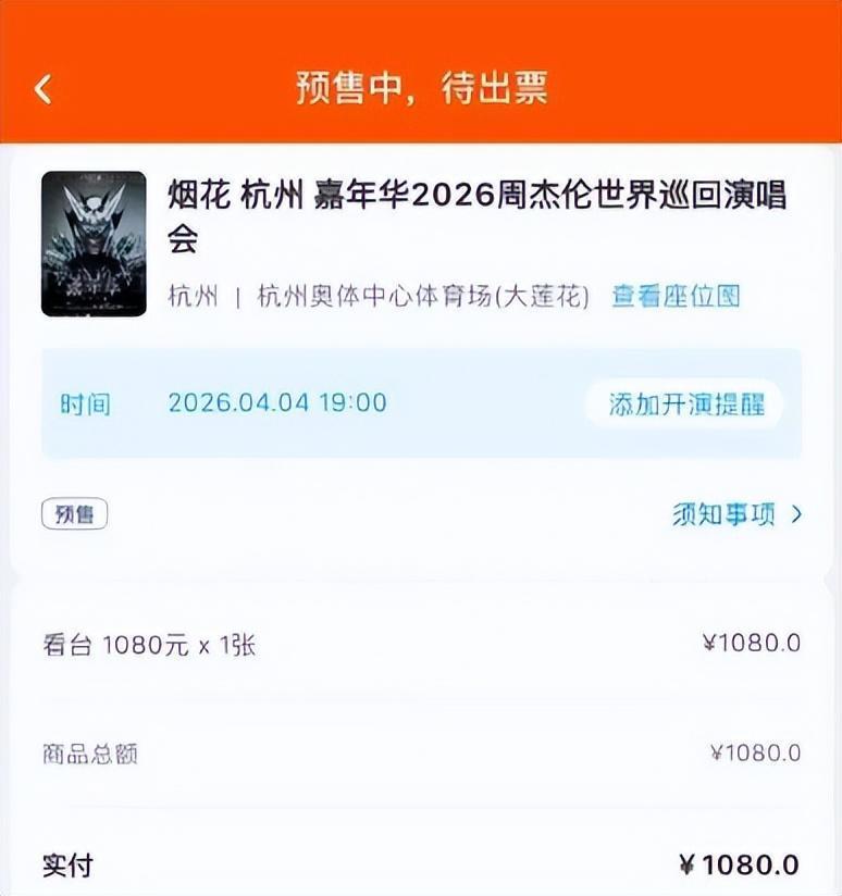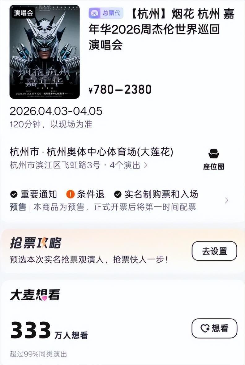刚刚,周杰伦「烟花杭州·嘉年华Ⅱ」2026全国巡演杭州站的第一轮开票矜重运转。票价从780元到2380元不等。